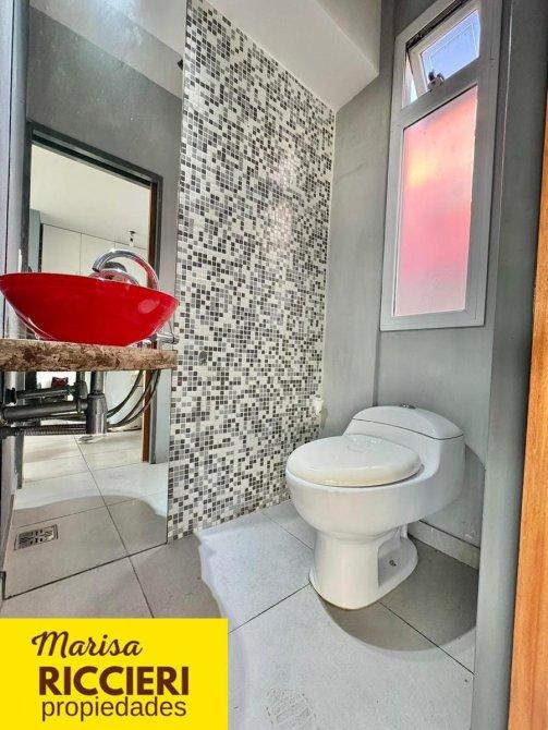 Amplio Living comedor y cocina integrada con lavadero, un Toilette recepción, salida a patio/jardín al frente con espacio verde independiente. Cocina con amoblamientos de bajo y sobre mesada, griferías y bacha de primera- Escaleras a planta alta con Hall distribuidor, DOS amplios dormitorios pisos porcelanato, ambos con placard y ventanas con muy buen ingreso AIRE/LUZ, Super luminosas. Un baño totalmente equipado, sanitarios y vanitory de primera. COCHERA en planta baja con acceso portón automático.